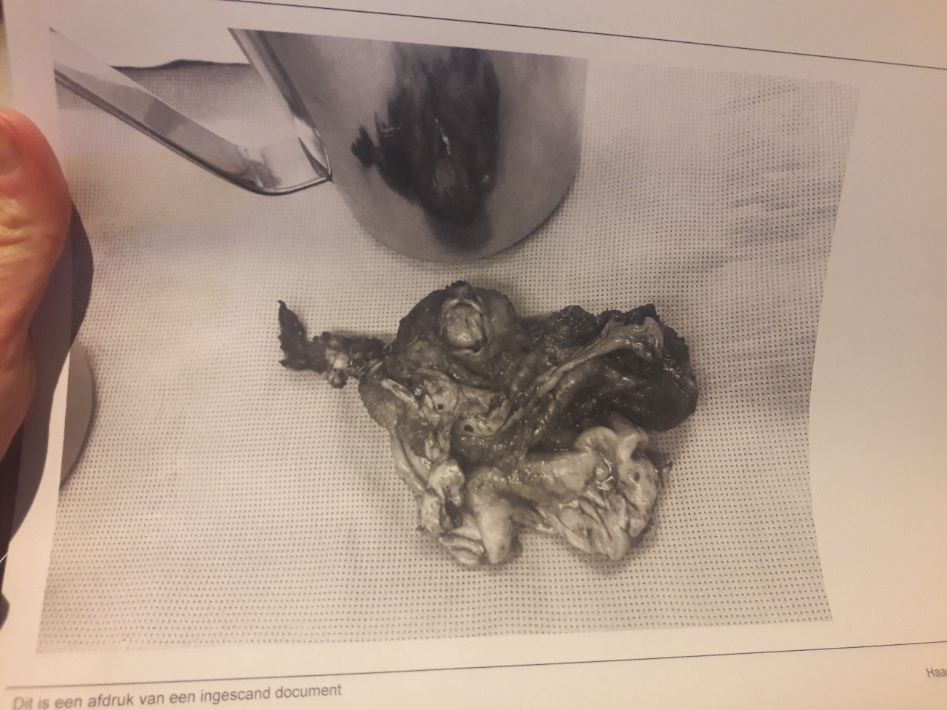 Op 11 december jl. zijn de protheses verwijderd door dr. de Vreeze, plastisch chirurg HMC. Na de explantatie verklaarde hij mij persoonlijk dat de ene prothese in een flinterdun kapsel zat en dat de andere helemaal als een gatenkaas kapot was en dat de siliconen vloeibaar erom heen zaten en dat ik heel blij mocht zijn dat ze eruit zijn.