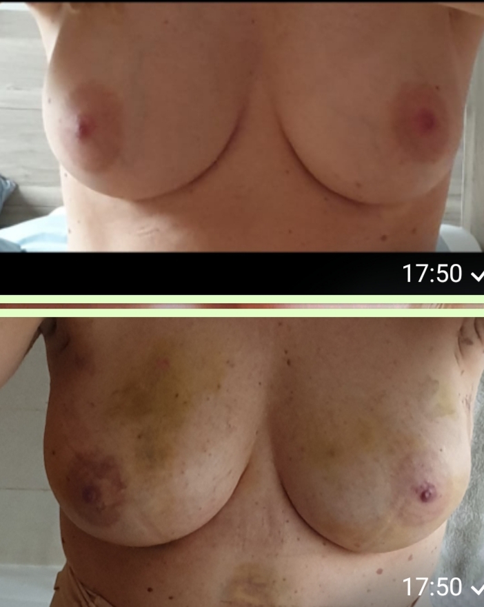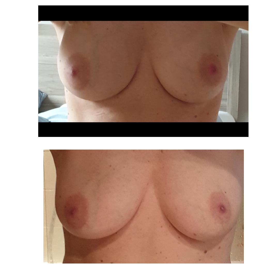 Nu 3 maanden verder, ik zal foto's plaatsen van het resultaat voor degenen die daar iets aan hebben, benieuwd zijn naar wat er overblijft na 3 maanden. Ik heb even verschillende posities gefotografeerd (bijv zittend, liggend en half zittend in bad, en zijwaarts), dan is het resultaat het best vergelijkbaar. Iedere foto is de bovenste nog met implantaten en de onderste dezelfde positie zonder implantaten.