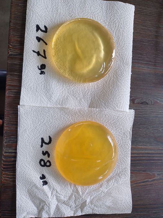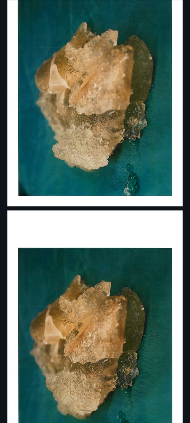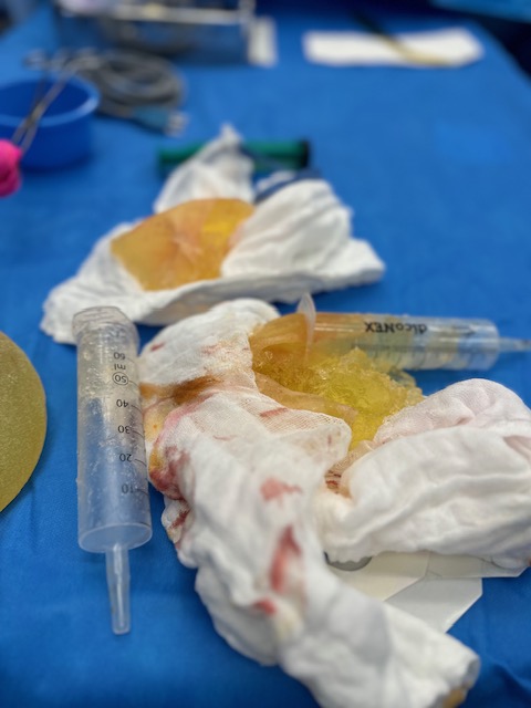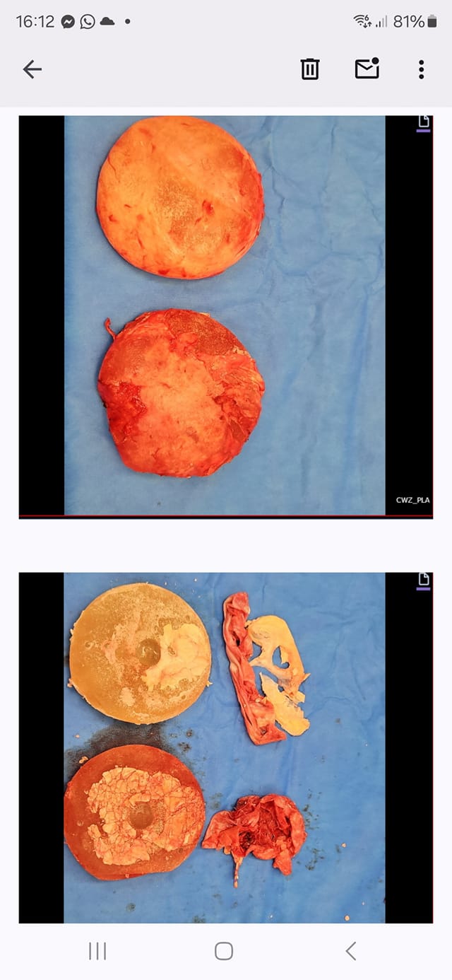 Verwijderde Eurosilicone implantaten van een forumlid. 9 jaar in haar lichaam gehad. Ze kreeg opeens een afwijkende vorm en pijn aan de rechterborst. Na enkele weken wachten een mammografie gekregen in het ziekenhuis. Niets op de zien. Toen een echo en daarop meerdere scheuren in beide implantaten....
