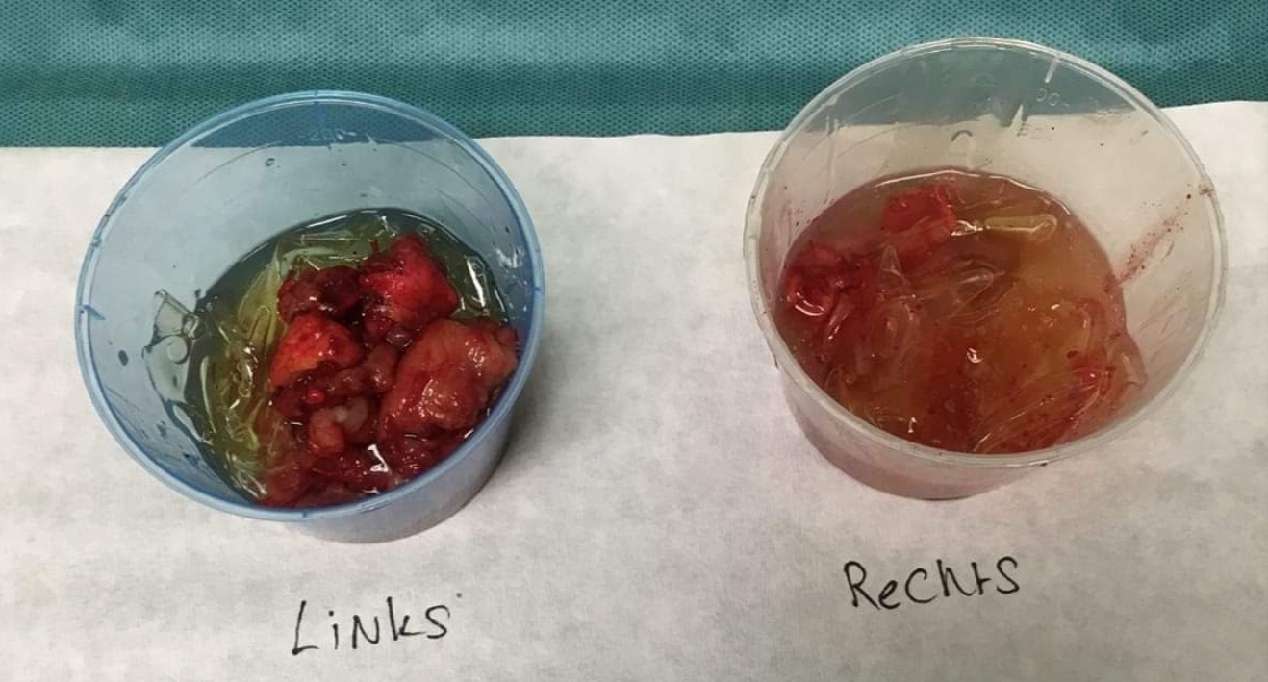 "Je hebt een hele goede beslissing genomen om de implantaten te laten verwijderen, want je implantaten waren heel erg aan het zweten. Het zag er uit als kaarsvet. Ik heb de pockets uitgebreid moeten spoelen om dit weg te krijgen."
