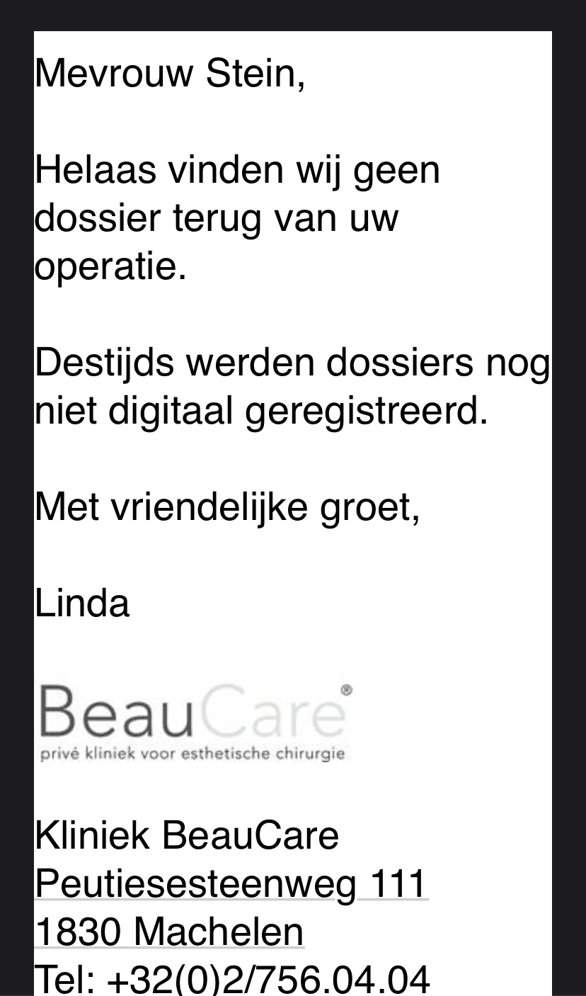 Ik ben teleurgesteld zeg en bedenk me nog welke stappen ik zal ondernemen. Ik weet dat ze liegen... omdat ik een aantal jaren geleden ook al eens een email gestuurd heb met de vraag of mijn implantaten veilig zijn.. en kreeg toen netjes antwoord dat ik me geen zorgen hoefde te maken. Ik weet dat ik niet de enige ben waarbij ze mensen afwimpelen met als antwoord dat ze het dossier kwijt zijn of nog niet digitaal waren... 2005 is het jaar dat ik ze heb laten zetten.. AS woe heb ik een afspraak bij de PC en dan zullen we zien wat zij te zeggen heeft.