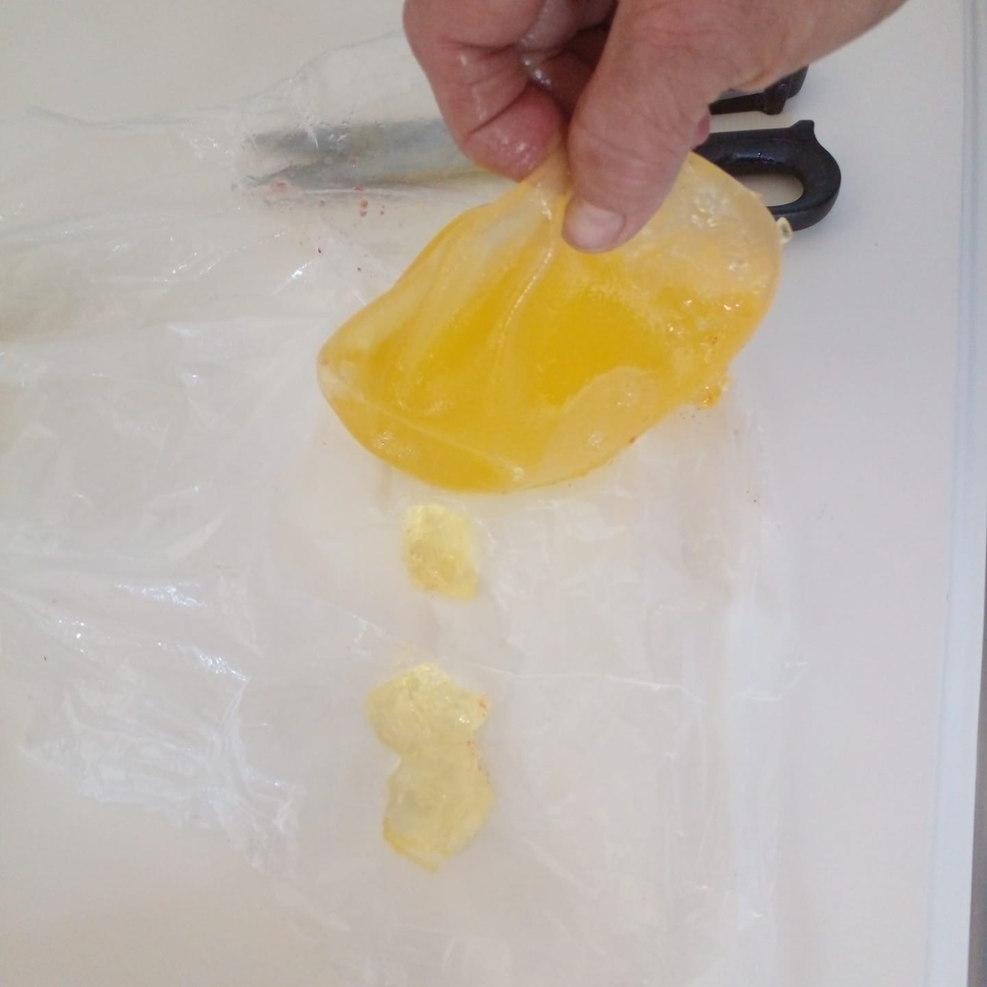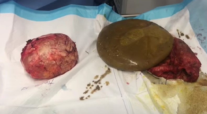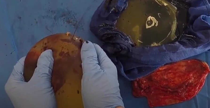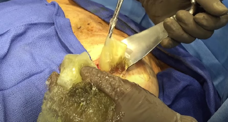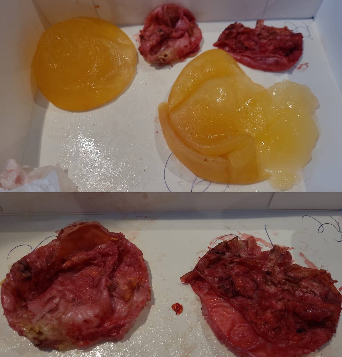 Gelbleed, rubberachtige kapsels met zeer veel ontsteking, enveloppen van de intacte implantaten die er zeer slecht uitzien en stukjes loslaten.